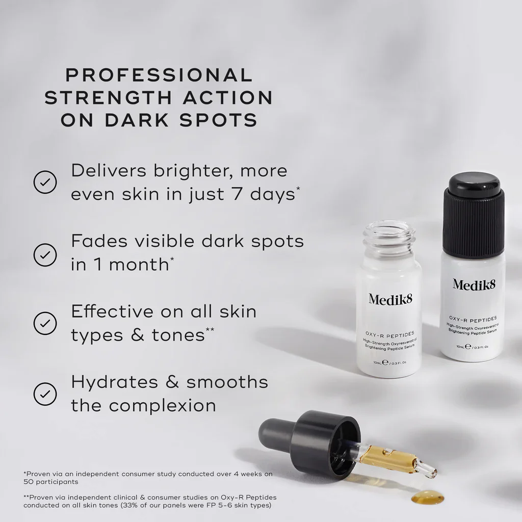 Medik8 Oxy-R Peptides is a powerful, targeted brightening serum designed to visibly reduce dark spots, uneven tone and stubborn pigmentation. Featuring an ultra-high 1% concentration of oxyresveratrol (Oxy-R) — one of the most potent hyperpigmentation actives available — this formula is stabilised using Medik8’s patented delivery and preservation technology to ensure maximum efficacy from the first drop to the last.