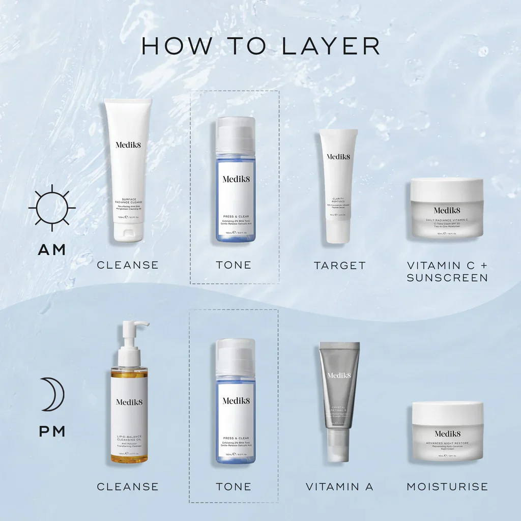 Medik8 Press & Clear is a clinically proven 2% BHA daily toner designed to visibly clarify, smooth and decongest the complexion — all while remaining exceptionally gentle on the skin. Optimised with Medik8’s unique encapsulation technology, this powerhouse exfoliant delivers salicylic acid gradually into the skin for effective results without the dryness or irritation typically associated with BHAs.